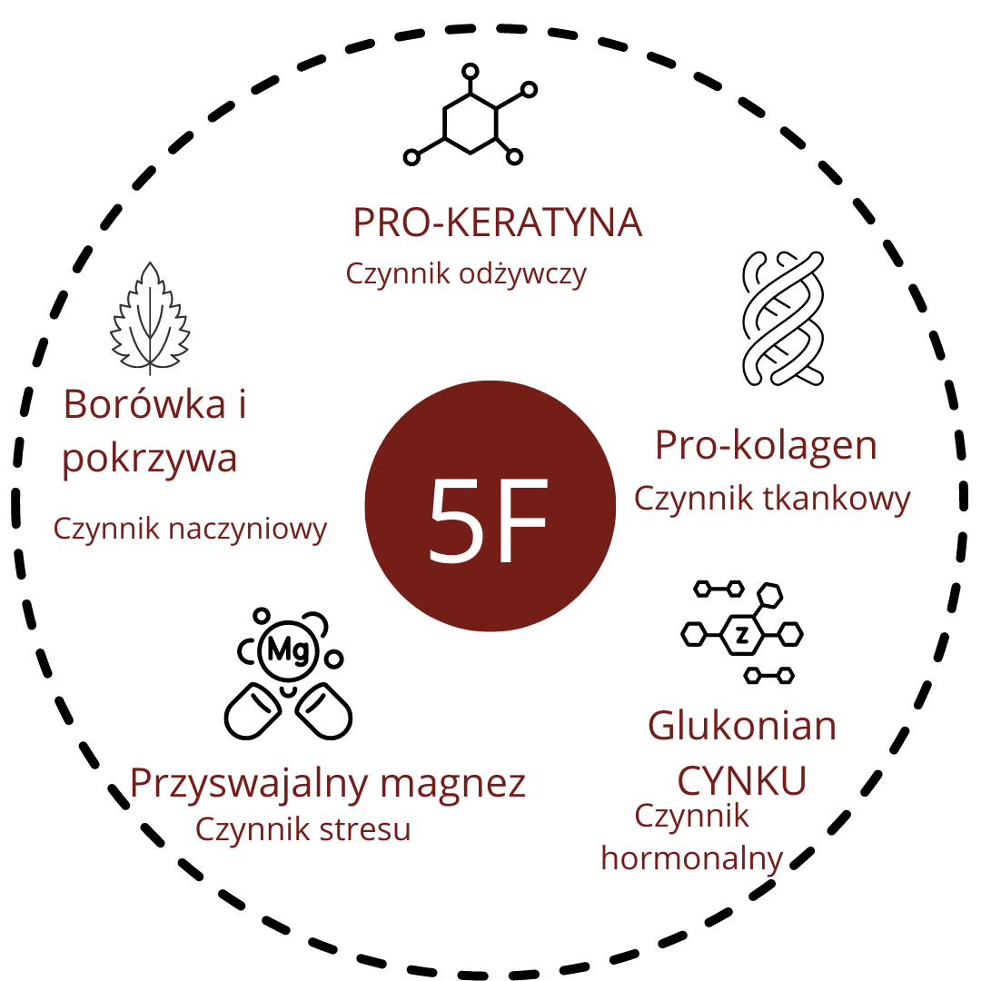 ŻYWIENIOWE: Wspieranie macierzy mieszka włosowego dzięki dostarczaniu niezbędnych składników odżywczych do cebulki włosa, takich jak aminokwasy prokeratynowe (metionina, cystyna oraz biotyna + witaminy B9, B12).
