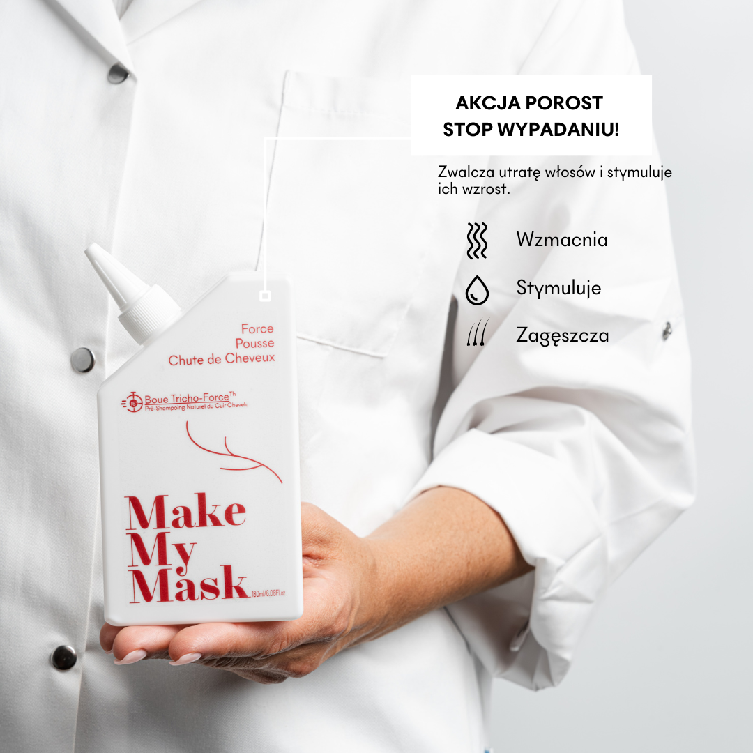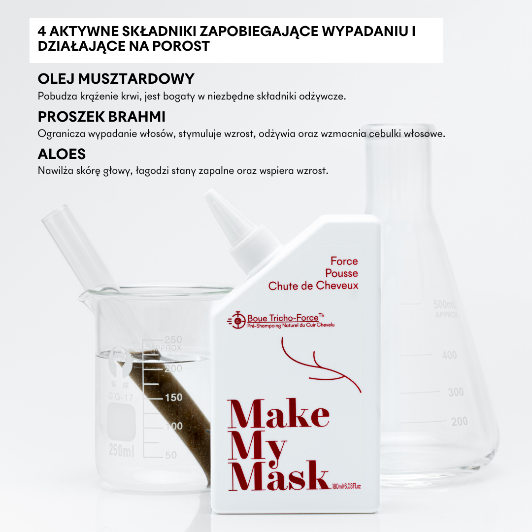 Nasza maska Tricho-Force zawiera wysoce skoncentrowane składniki naturalne dla skutecznej pielęgnacji skóry głowy i wsparcia zdrowego wzrostu włosów.