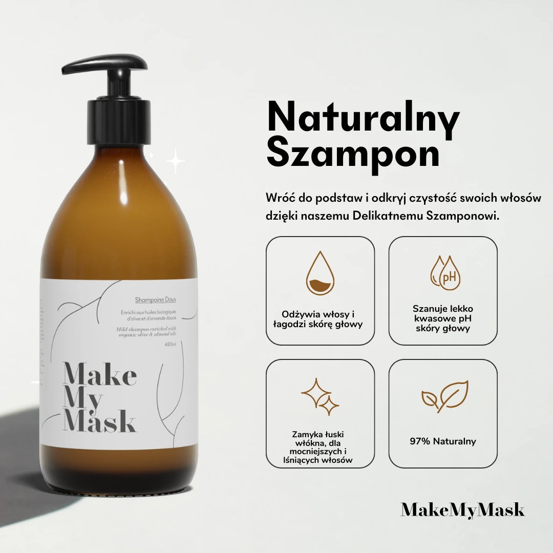 Odkryj blask swoich włosów dzięki naszemu Delikatnemu Szamponowi, stworzonemu z 97% naturalnych składników, dla autentycznej piękności. Jego lekka, kremowa pianka otacza Twoje włosy, zapewniając delikatne, łagodzące oczyszczenie bez obciążania skóry głowy. Doskonały towarzysz do spłukiwania naszych masek, jest wolny od siarczanów, silikonów i substancji zakłócających układ hormonalny. Wróć do podstaw, wróć do natury, dla zdrowych, promiennie pięknych włosów.